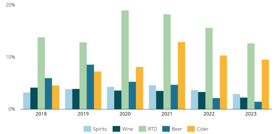 While I agree with much of the article's insights, I did notice a couple of issues with the column chart illustrating the 'Incremental Retail Sales Value of Innovations from 2018-23 by Categories.' For example, the article incorrectly suggests that the RTD category peaked in 2021, although the bar shows 2020. To improve clarity and comparison, using small multiples would allow for a more effective visual comparison between the categories (see example below).