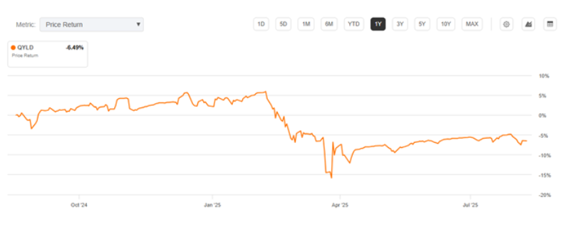 Total Return = price return + option premiums + dividends. For the same QYLD, the total return was +6.27% over the past year.