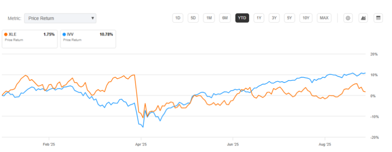 Take a look at the chart below comparing Year-to-date performance of Energy Stocks (XLE - The Energy Select Sector SPDR® Fund ETF) vs S&P 500 (IVV - iShares Core S&P 500 ETF)