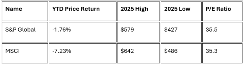 As of today, SPGI's stock price has fallen from its highs near $579 to around $489, and MSCI has dropped from ~$642 to ~$556, both marking negative moves for the year after a strong start.