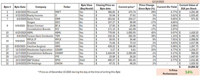 As we wrap up the year, it felt like a good time to zoom out and ask a simple question: how have the ideas in this newsletter actually done so far? Since April, several of my Bytes have focused on individual stocks, along with a comprehensible “yes,” “hold,” or “no” on whether they were worth buying at the time. I’ve summarized those stock-focused Bytes in the table below, along with how each idea has held up since its publication date.